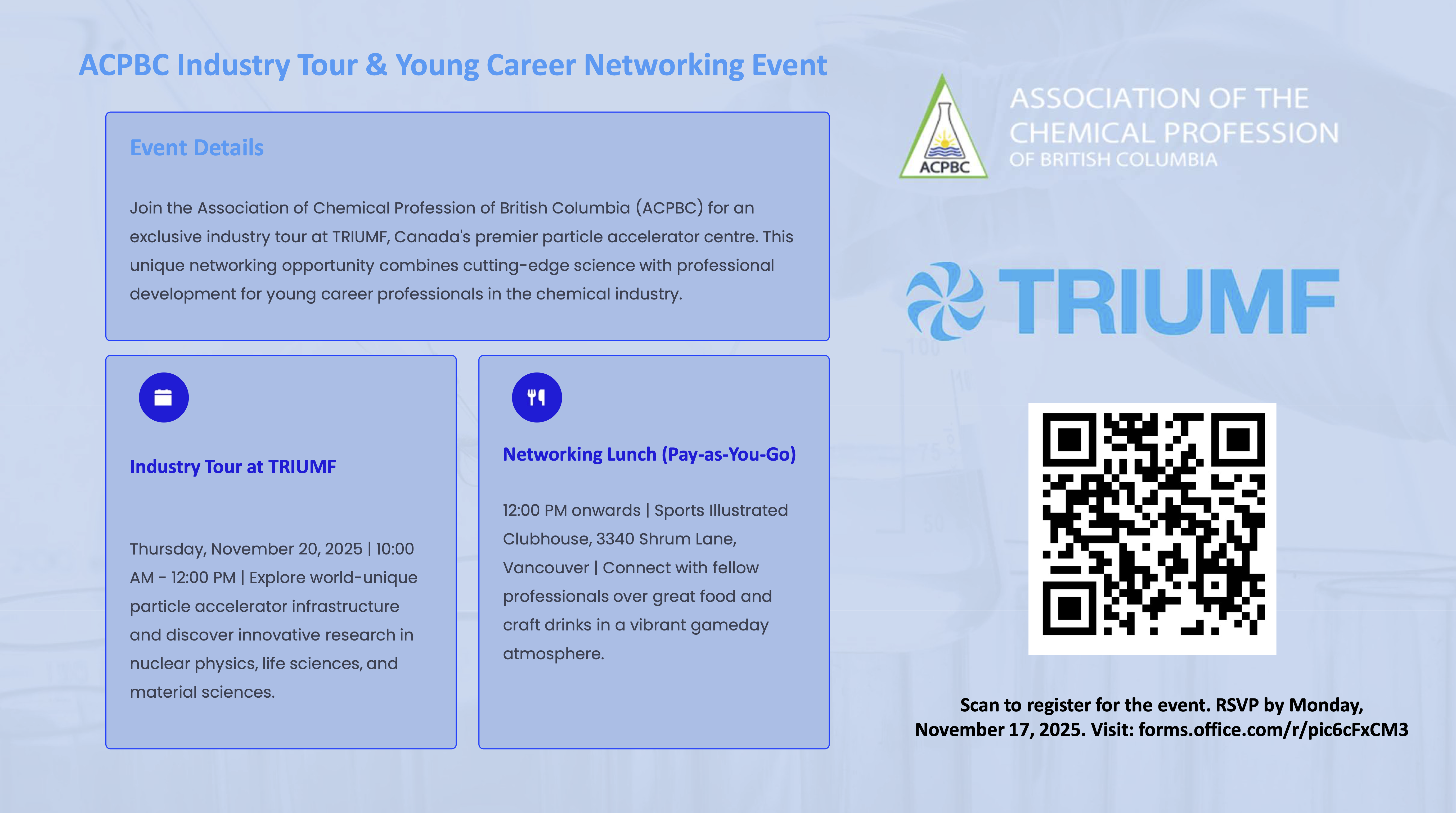 Join fellow ACPBC members for an exclusive industry tour at TRIUMF! ByAdminstrative Coordinator October 24, 2025October 31, 2025 REGISTER NOW